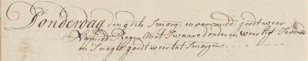 Caribbean 9 September 1762 Essequibo, Guyana First mate’s logbook In the morning and forenoon the weather was good. In the afternoon we had rain with heavy thunder and lightning. In the evening and night we had good weather till morning. Logbook Tags No tags