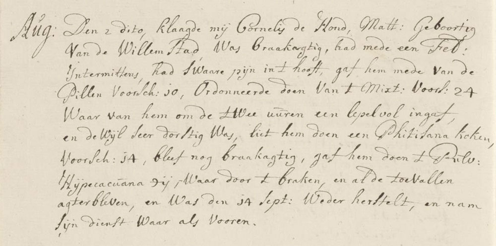 The 2nd of August, Cornelis de Hond, a sailor born in Willemstad, was nauseous, had an infectious disease amongst others, and a severe headache. I gave him pills (Prescription 10) and a mixture (Prescription 24) of which he had to swallow a spoonful every two hours. As he was very thirsty, I boiled him a barley drink (Prescription 14). He remained nauseous, hence I gave him a pulverized emetic. After this the vomiting and the seizures stopped. He was recovered on the 14th of September and took his shift again.
