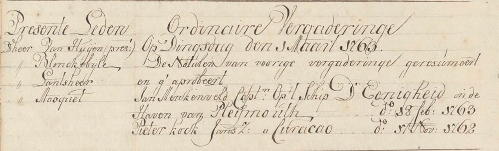 Letters received and read: Jan Menkenveld, captain on the snow ship The Unity, in the port of PlymouthEngland, United KingdomPlymouth, on 18th February 1763.