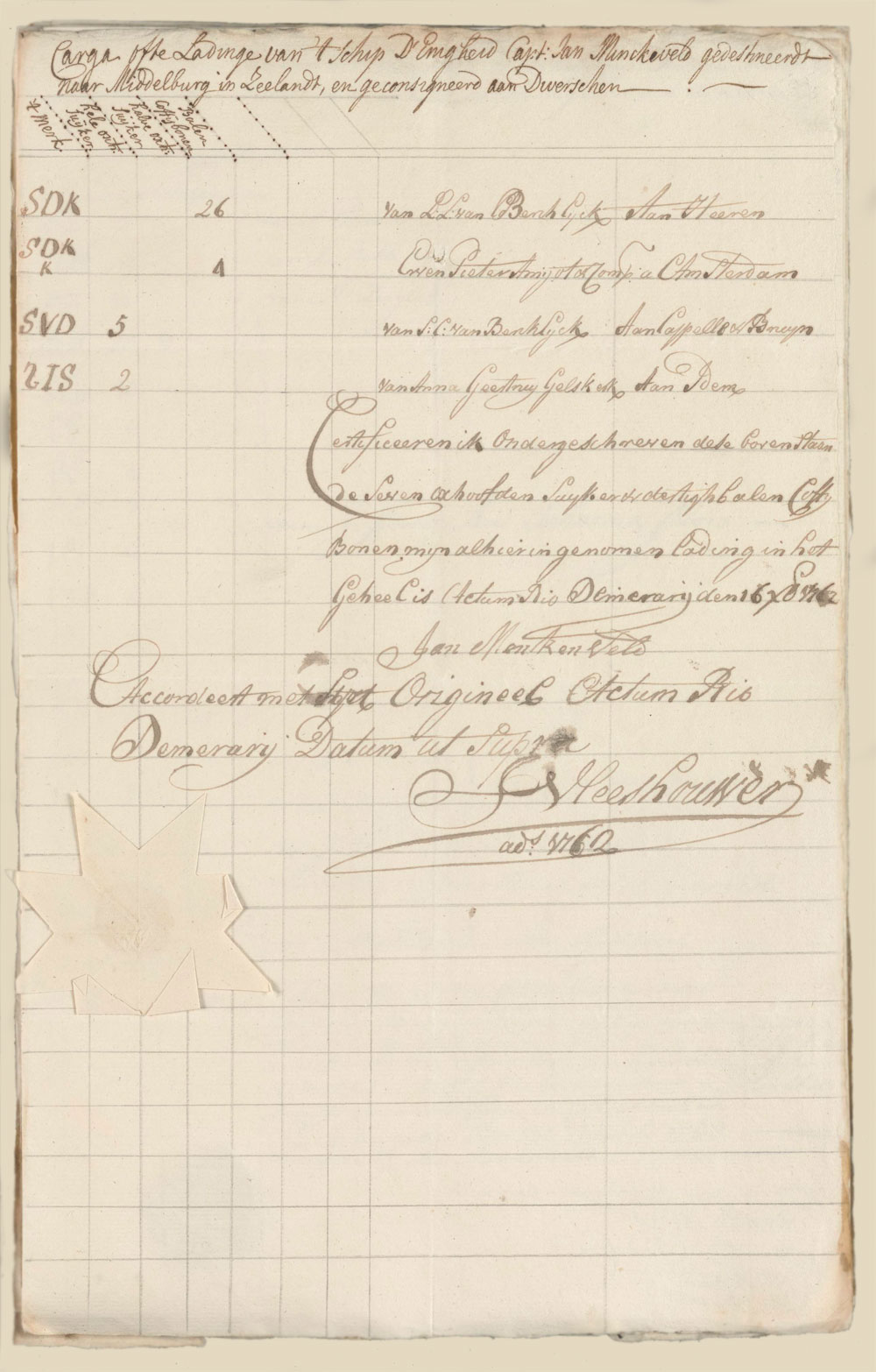 Certificeeren ik ondergeschreven dese bovenstaande seven oxhoofden suijker & dertigh balen coffijbonen, mijn alhier ingenomen lading in het geheel is (actum) Demerara RiverGuyanaRio Demerarij den 16 december anno 1762.