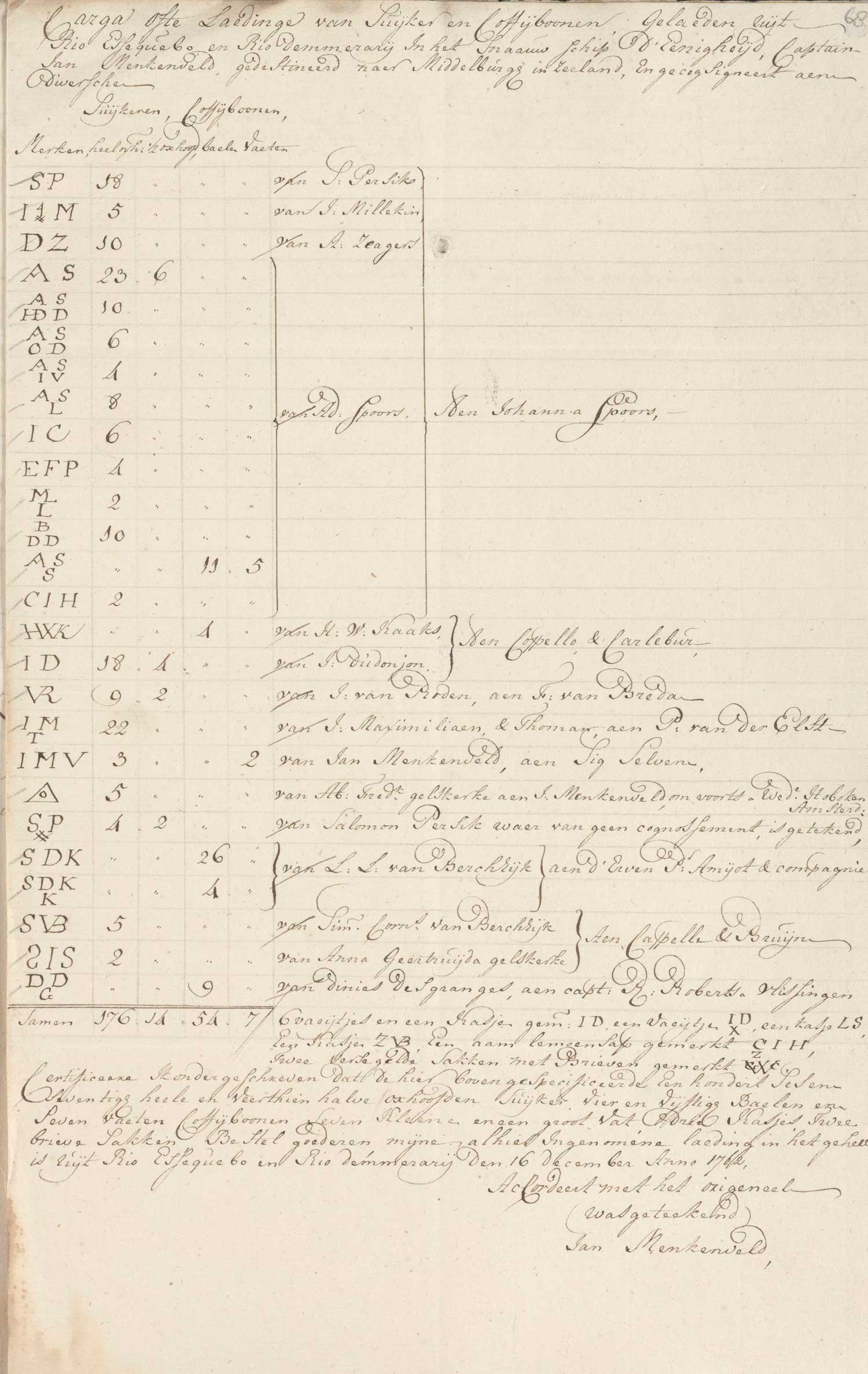 I, the undersigned, certify that the above specified 176 whole and 14 half hogsheads of sugar, 54 bales and 7 barrels of coffee beans, 7 small and 1 large barrel, 3 chests, 2 letter bags, ordered goods, the whole cargo as taken in by me, comes from Rio Essequibo and Rio Demerara, 16 December anno 1762