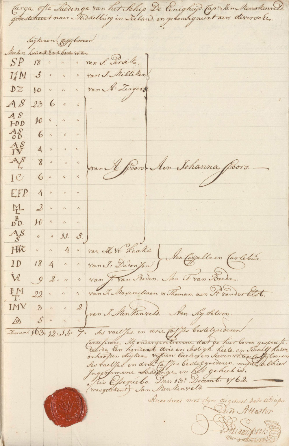 Cargo of the ship the Unity, captain Jan Menkenveld, destined for Middelburg in Zeeland and in custody of various sugars, coffee beans.