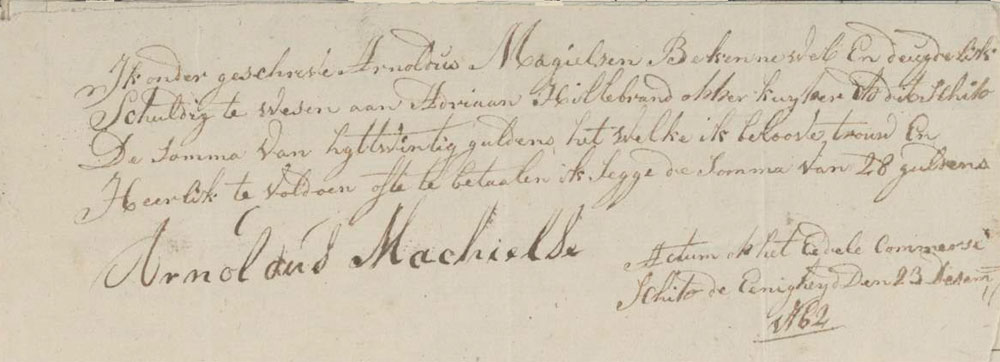 I, Arnoldus Magielsen, declare to owe the sum of 28 guilders to Adriaan Hillebrand, first cooper on this ship, which I promise to pay back faithfully and honestly.