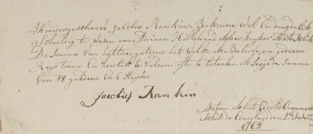 I, Jacobus Rankin, declare to owe the sum of 18 guilders to Adriaan Hillebrand, first cooper on this ship, which I promise to pay back faithfully and honestly on completion of the journey.