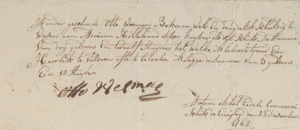 I, Otte Wesman, declare to owe a sum of 3 guilders and 12 nickels to Adriaan Hillebrand, first cooper on this ship, which I promise to pay back faithfully and honestly.