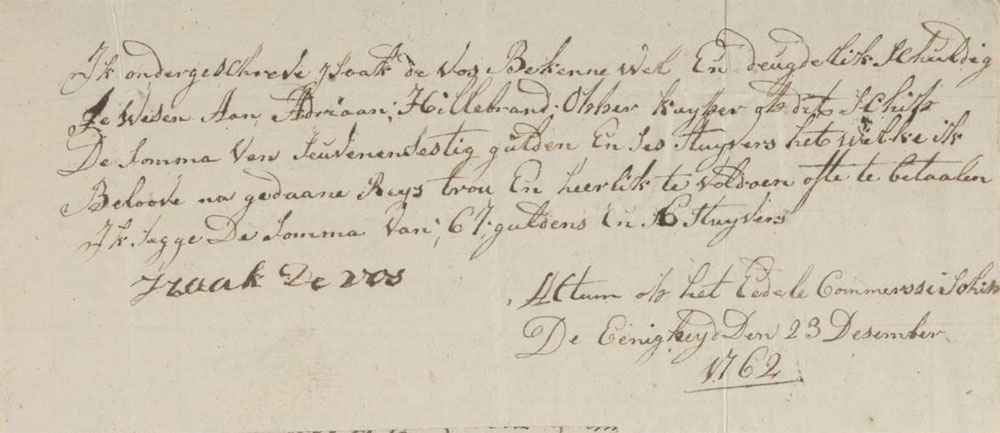 I, Isaäk de Vos, declare to owe Adriaan Hillebrand, first cooper on this ship, the sum of 67 guilders and six nickels, which I promise to pay back faithfully and honestly on completion of the journey.