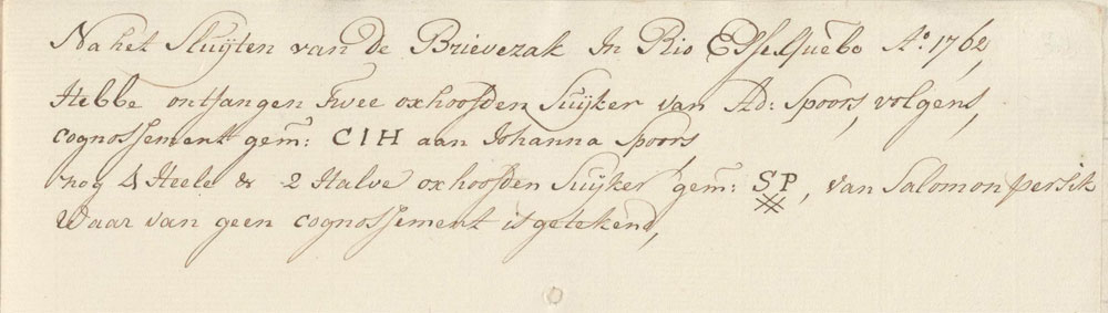 - two hogsheads of sugar from Adriaan Spoors, branded CIH according to the bill of lading, to Johanna Spoors
