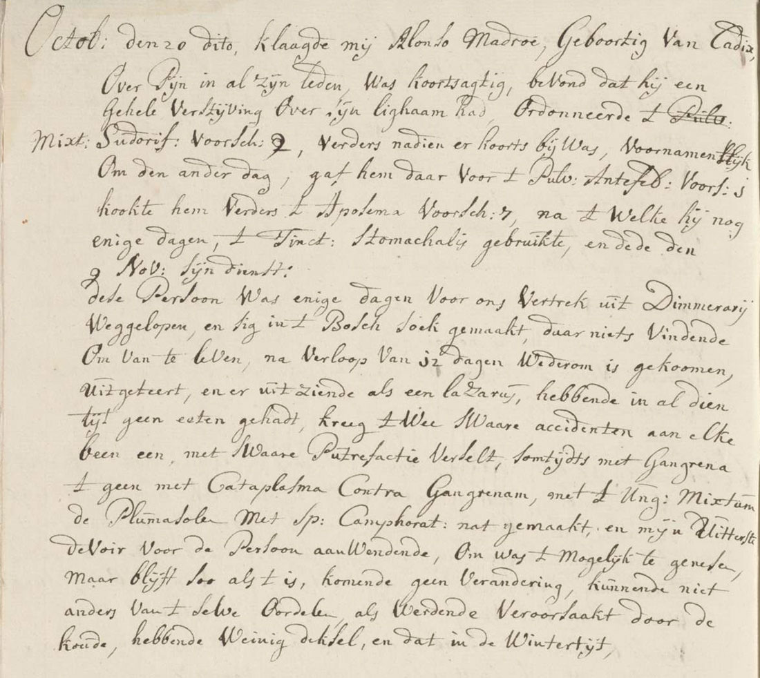 On the 20th of this month Alonso Madroe from Cadiz came to me with complaints. He had pain in all his limbs, a fever and I also found out that he had an overall stiffness over his body. Because he had also a fever, mainly every other day, I prescribed a sudorific mixture (prescription 2). I also gave him something pulverized against the fever (prescription 1). Furthermore I boiled an extract (prescription 7) for him, and for several days he used a stomach elixir. He took his shift again on the 9th of November. Some days before our departure from DemeraraGuyanaDemerary, this person ran away from the ship and got lost in the woods. Because he found nothing there to live off, he came back after twelve days and was completely emaciated. After not having had food in all that time he looked like a Lazarus. He had two serious defects on each leg accompanied by a serious, sometimes gangrenous, putrefaction. I wetted it with an ointment plaster against gangrene with a mixed sunflower ointment of camphorated spirits. I did my utmost in order for the person to be cured, but it stayed as it was. With no change occurring, I could not judge differently than that it was caused by the cold: he had had little cover, and that during the winter time.