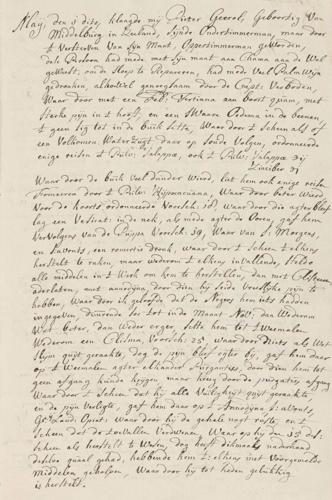 On the 1st of this month Pieter Geerolf, from Middelburg in Zeeland, came to me. He had been under carpenter but due to the death of the master carpenter he had been promoted. This person had been on the shore of ShamaGhanaFort St. Sebastian to repair the sloop with his mate. Even though it was forbidden by the captain, he had drunk a lot of palm wine. Because of that he came aboard with malaria with a severe headache and a bad edema in his legs. The edema set itself in the stomach, and it seemed like a bad dropsy would follow it. Some voyages I prescribe pulverized mirabilis jalapa, therefore now also two scruples of pulverized mirabilis jalapa and one scruple of ginger. This made his stomach a lot thinner. Some voyages I had also made the patient vomit using a pulverized emetic, and also now this made it better. I prescribed other things (prescription 18) against the fever, which limited it. He had also a blister in the neck, as well as behind the ears. I gave him some of the elixir (prescription 19), of which he drank a small glass in the morning and in the evening. This made him seem recovered after every drink, but he relapsed constantly. I tried everything to make him recover: laxation through a clyster, bleedings with painkillers. This gave him horrible pains, which made me believe that the Africans had given him something. It lasted like this into the month of November, sometimes he improved, sometimes he relapsed again. Twice I gave him another clyster (prescription 25), which made him lose nothing but slime while the pain remained. Since he could not relief himself, I gave him a laxative twice in a row. He got relief due to the purgatives, which made it seem like he lost all the nastiness and relieved him from pain. I then gave him the painkillers and in the evening two grains of opium. This made him rest all night and it seemed as if the seizures disappeared, after which he seemed recovered the 15th of this month. But since then he has often had the same disease. I helped him every time with the above-mentioned means, which have luckily made him recover now.